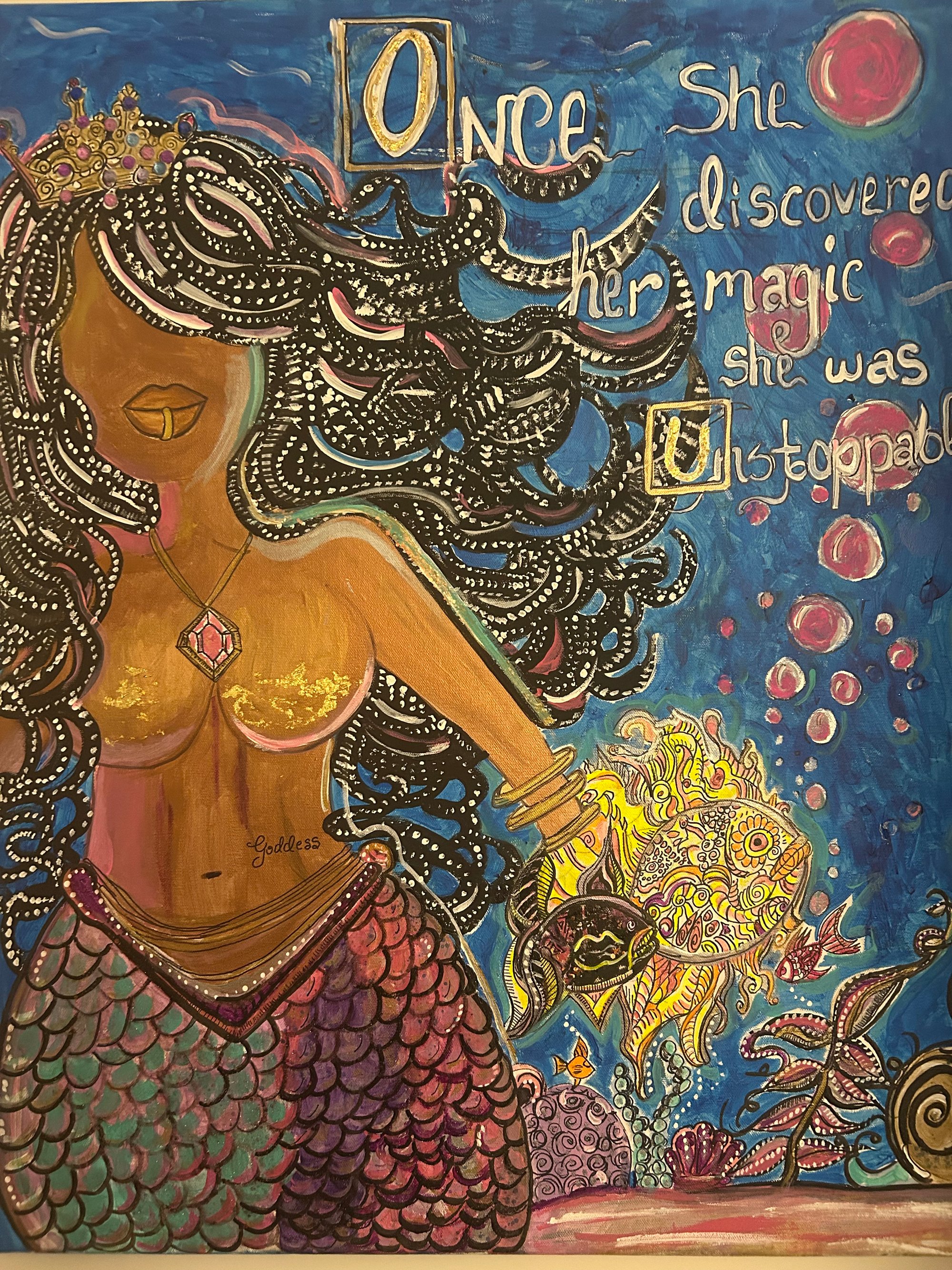 Goddess mermaid under the sea discovering her inner strength is a piece beautifully painted in acrylic paint adorned with rhinestones on her crown. 36x24 stretched canvas