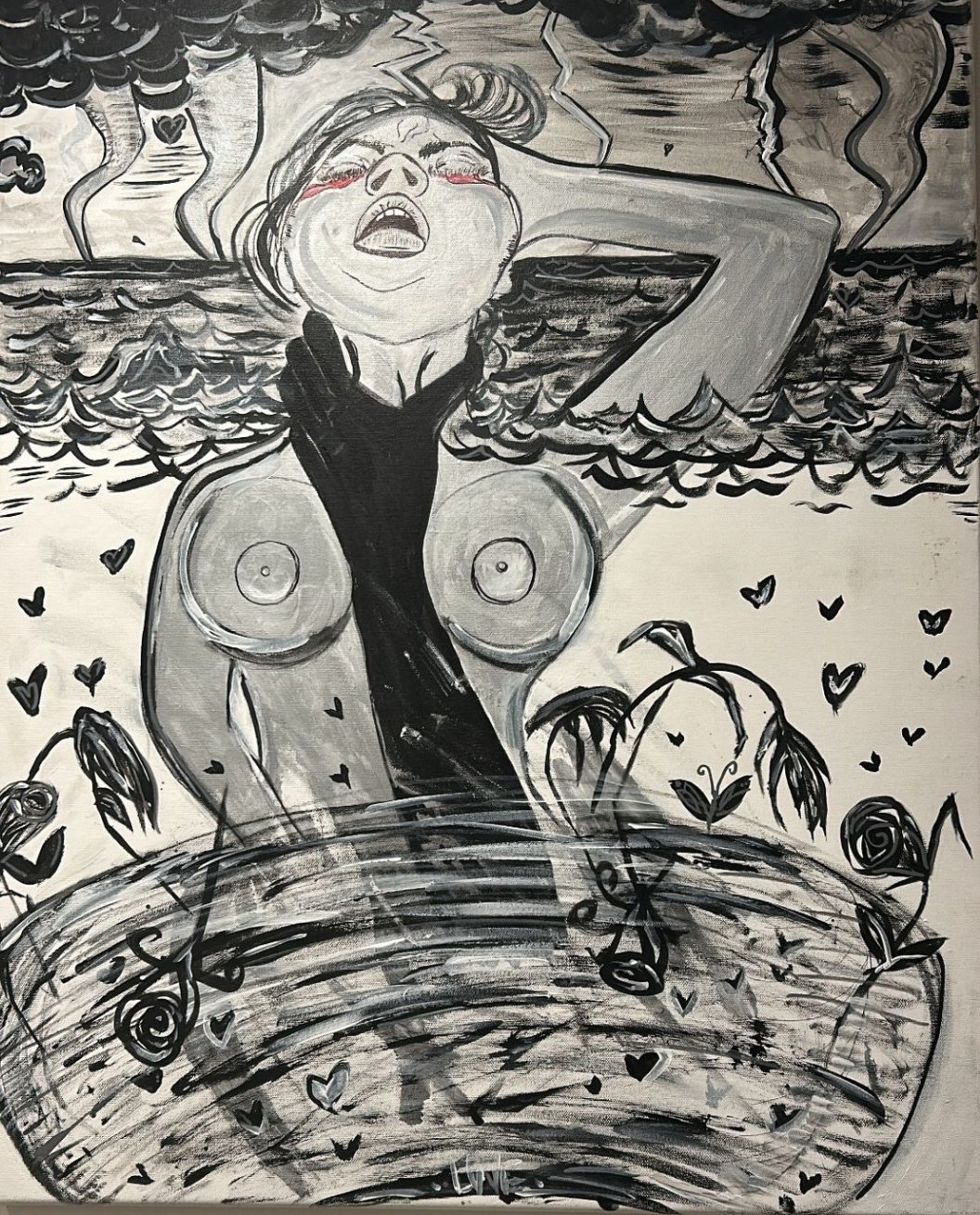 Black n white depiction of a woman dying and cumming at the same time the hand choking her and tornado are both a lover that is hurting her and satisfying her at the same time